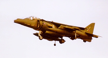| aharrier.jpg | 23451 bytes | GR.7 - ZG511 - No.4 Sqn Recovering slowly with nozzles set nearly vertical. Note the distinctive FLIR lump on the nose distinguishing the GR.7 from the earlier GR.5, and the small outrigger wheels. - Paul Crossley's (RAF) Plane Page |