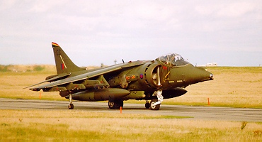 | gharrier.jpg | 37347 bytes | GR.7 - ZG477 - No.4 Sqn Taxiing down to take off from RAF Valley, this example has fuel tanks only on its inner pylons. The forward jet nozzle is set to approx. 45°, with as yet unused gun pods just visible below. - Paul Crossley's (RAF) Plane Page |