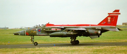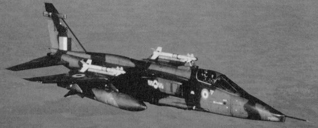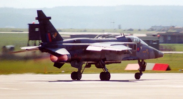 | ajaguar.jpg | 25655 bytes | GR.1A - XZ372 - No.6 Sqn, RAF Coltishall Sporting under-wing drop tanks and over-wing sidewinder missiles, this example makes its landing approach to RAF Coltishall in Norfolk. - Paul Crossley's (RAF) Plane Page |