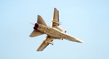 Stationary on the runway just prior to brake release, the thunderous afterburning engines straining to go. Note the large under-wing fuel tanks & wide track undercarriage.