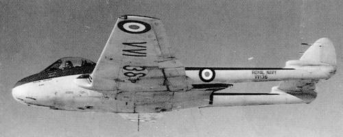 | ARN-cvampire.jpg | 15949 bytes | B/w of a Sea Vampire inflight. On 3rd December 1945 a converted RAF Vampire I made the first landing by a jet aircraft on a carrier (HMS Ocean). As a result of these trials the RN ordered an navalised fighter based on the Vampire FB5. The poor acceleration of the turbojet made carrier take-offs difficult so it served mainly in training roles, giving FAA pilots jet experience. The first F20 flew in October 1948 and the last had been delivered by June 1949. Several Vampires were modified as F21s which had reinforced undersides for "flexi-deck" landing trials. This involved the undercarriageless aircraft bouncing down onto the rubberised flight-deck of HMS Warrior. Although the trials were a success, the idea did not catch on. The Sea Vampire served in a purely training role as the T22 into the 1950's. A total of 30 F20 were ordered but it is believed that only 18 were delivered, likewise different sources give 2 or 6 as the number of F21 conversions. |