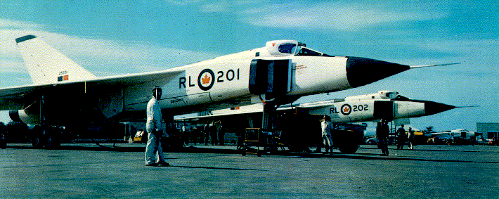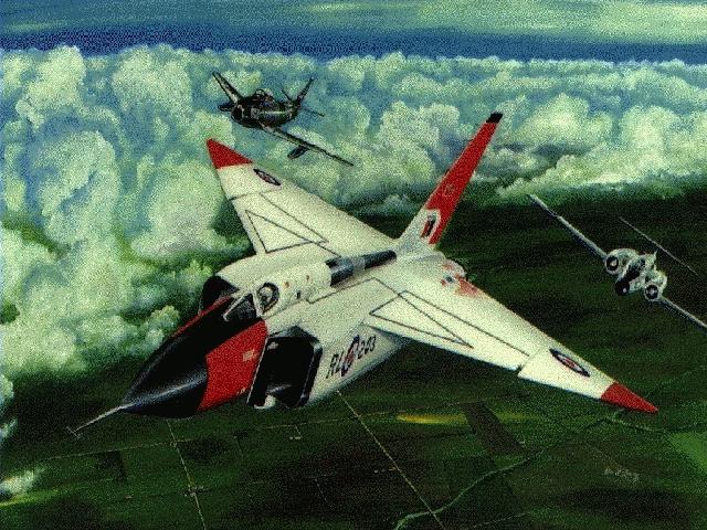 | ARROW.JPG | 92508 bytes | RL-203 prototype escorted by a Canadair Sabre and a Avro CF-100. |