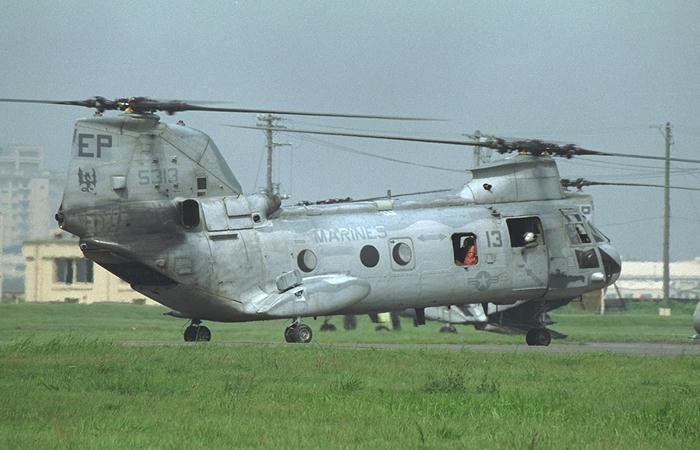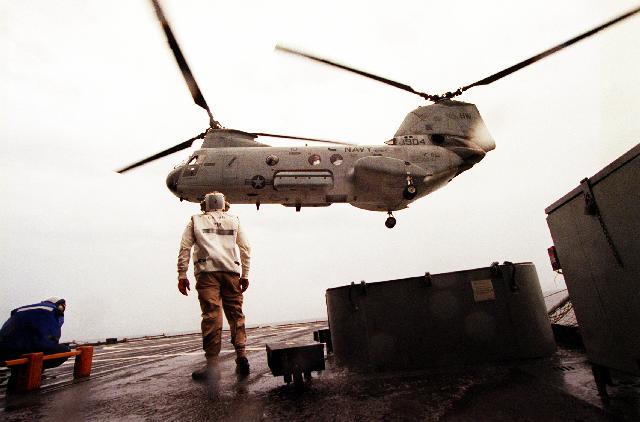 ASCIET '96. A CH-46 Sea Knight helicopter with Helicopter Combat Squadron Six (HC-6) lifts off the deck of the guided missile cruiser USS Anzio (CG 68) in an early morning fog. HC-6 provided passenger service for visitors and contractor personnel during a live missile shoot off Wallops Island, Va. Anzio participated in the final segment of the All Services Combat Identification Evaluation Team Exercise (ASCIET '96). U.S. Navy Photo by Photographer's Mate First Class Gregory S. McCreash. [960904-N-7412M-003] September 4, 1996.