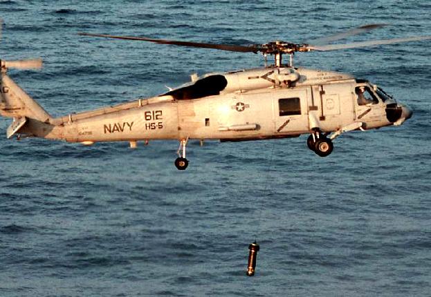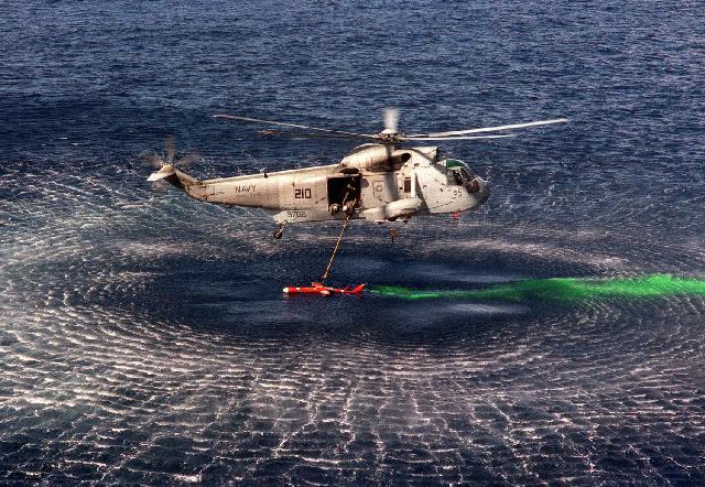 An SH-60F Seahawk from the "Nightdippers" of Helicopter Anti-submarine Squadron Five (HS 5) hovers sixty feet above the Mediterranean Sea and lowers its dipping sonar as it tracks for submarines, June 19, 1996. The Seahawk provides inner circle anti-submarine warfare defense for the carrier battle group. HS 5 is based aboard the carrier USS George Washington (CVN 73). U.S. Navy photo by Photographer's Mate Second Class Jim Vidrine [960619-N-7340V-002] 19 June 1996.
