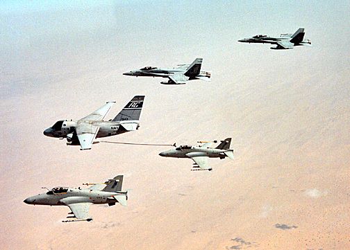 | s3-reful.jpg | 35793 bytes | Pit stop. An S-3B Viking from Anti-submarine Squadron Three One (VS-31), the "Topcats", prepares an in-flight refueling with two Royal Omani Air Force Hawk fighters (below) as two U.S. Navy F/A-18C Hornets from Strike Fighter Squadron One Three Six (VFA-136) await their turn. The Navy aircraft, participating in Exercise Beacon Flash with the Royal Omani Air Force, are part of Carrier Air Wing Seven embarked in USS George Washington (CVN 73). The carrier is deployed to the Arabian Gulf in support of Operation Southern Watch, enforcing the "no-fly" zone over southern Iraq. U.S. Navy photo by Cmdr. Win Everett - Apr. 8, 1996 [960408-N-5918E-001] - US Navy Digital Imagery |