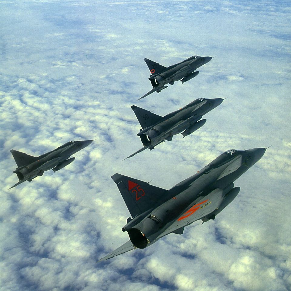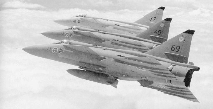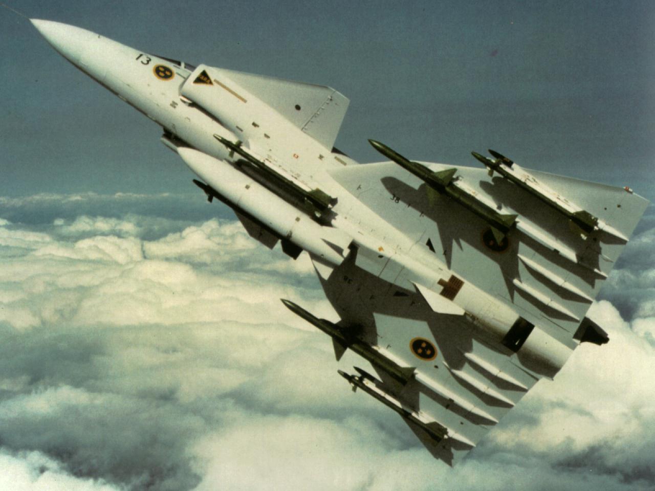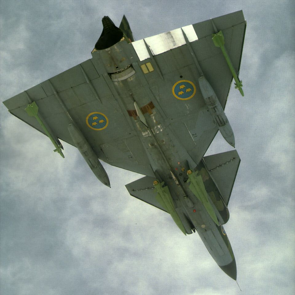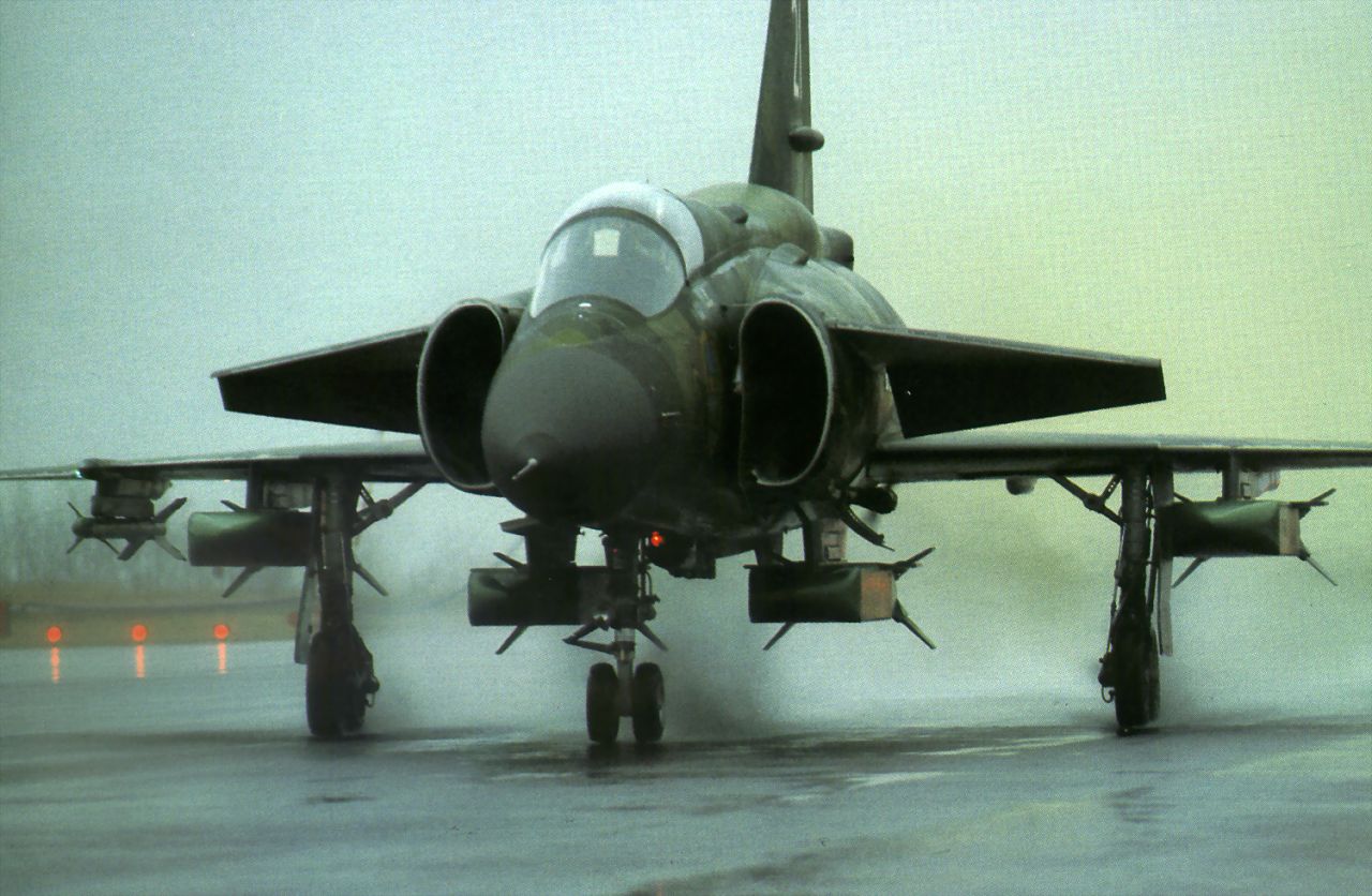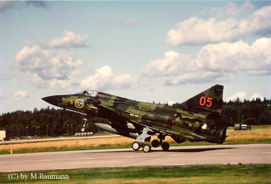 | AJ37_01.JPG | 92156 bytes | This AJ37 is armed with two Rb05 attackmissiles, two 30-mm Aden giunpods and two Rb24J (Sidewinder). Note rtyhat the plane doesn't has it external fuel tank fitted and the white paint at the tailerons. Before the AJS-mod the AJ could carry the Rb24 at the hardpoints where it's in this pic but it lacked wiring to fire it. Also there is a limit on how much time a plane can fly with missile fitted at this hardpoint |