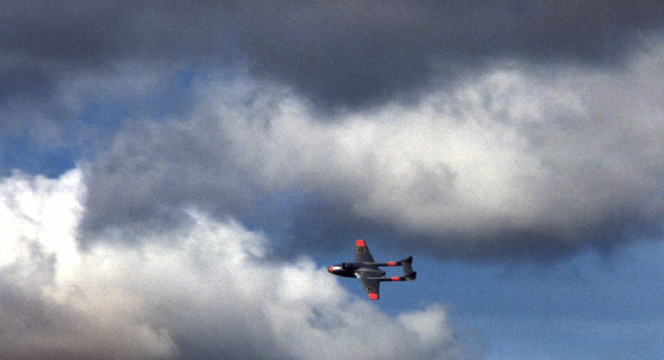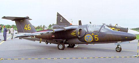 | SAABS.JPG | 50756 bytes | four different Saab aircraft flying in formation. The one in front is a Saab 105 twin-turbojet two-seat light attack/trainer aircraft. The black and white aircraft to the right is a A-32 "Lansen". |