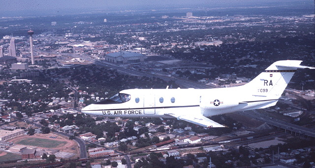 Side shot of a Randolph Jayhawk over the home town--San Antonio