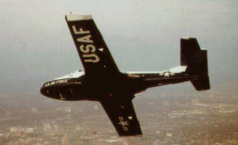 A T-37 inflight, standing on the wing