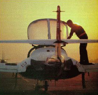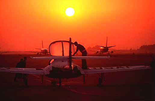 Sunset view of a crew chief bedding down a T-37
