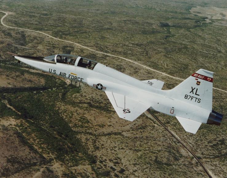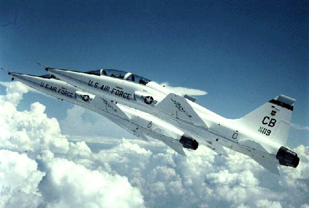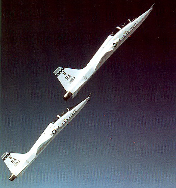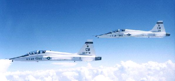 Two Columbus AFB T-38s in formation, one's the Wing Commander's aircraft